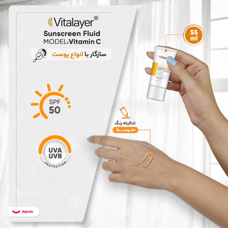 فلوئید ضدآفتاب رنگی ویتالیر، 50 SPF، مدل Vitamin C، مناسب انواع پوست تنالیته رنگ متوسط و حجم 50 میلی‌لیتر، ضد آب، محافظت کننده در برابر اشعه UVA، UVB، IR، آنتی‌اکسیدان، فاقد چربی و پارابن، ضد لک، آبرسان، دارای فرمولاسیون غیرکومدون‌زا، با ماندگاری 2 ساعته