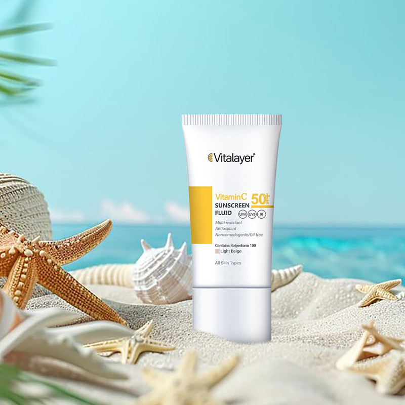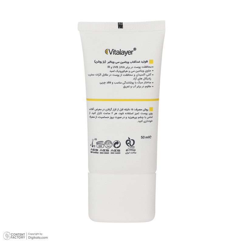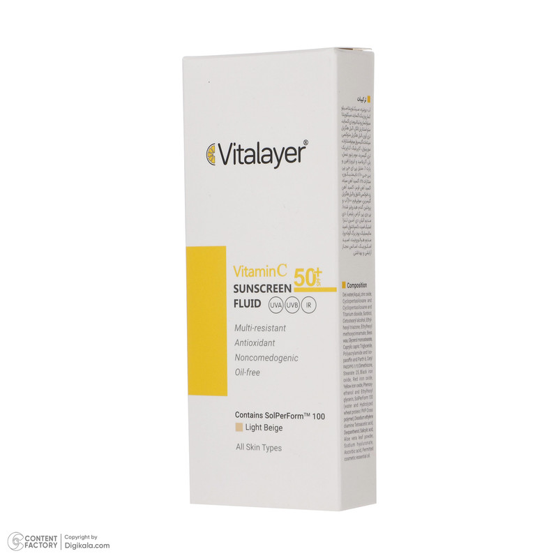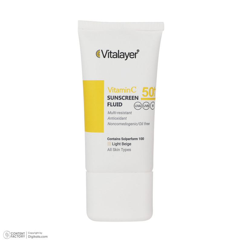 فلوئید ضدآفتاب رنگی ویتالیر، 50 SPF، مدل Vitamin C، مناسب انواع پوست تنالیته رنگ متوسط و حجم 50 میلی‌لیتر، ضد آب، محافظت کننده در برابر اشعه UVA، UVB، IR، آنتی‌اکسیدان، فاقد چربی و پارابن، ضد لک، آبرسان، دارای فرمولاسیون غیرکومدون‌زا، با ماندگاری 2 ساعته