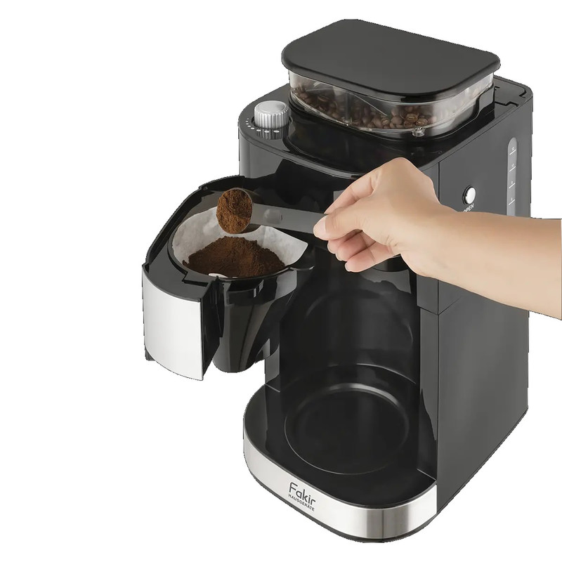 روش های تهیه قهوه مختلف است و برای علاقمندان به نوشیدن قهوه استفاده از دستگاه مناسب بسیار مورد توجه است.قهوه ساز فکر مدل KM6151 از جمله محصولات بسیار با کیفیت این برند خوشنام المانی است.این دستگاه می تواند با طراحی زیبا و کارایی بسیار مناسب خود ، لذت نوشیدن یک فنجان قهوه را برای شما بیش از پیش کند.این دستگاه قابلیت تهیه قهوه فرانسه را دارد که به ان قهوه دمی نیز گفته می شود.قابلیت برجسته قهوه ساز فکر یا فکیر مدل KM 6151 داشتن اسیاب قهوه است و شما می توانید مستقیما از دانه های تازه قهوه به نوشیدنی مورد نظر خود برسید.اسیاب این قهوه ساز دارای قابلیت تنظیم درجه پودر شده گی یا به اصطلاح درجه نرمی قهوه است که می تواند متناسب با ذایقه شما متفاوت باشد و برای این منظور دارای 8 درجه قابل تنظیم است.این قهو ساز شرکت Fakir حتی از طراحی زیبایی نیز برخودار است و بدنه ان ترکیبی از فلز استیل و پلاستیک مرغوب است بنابراین می توانید از ان هم در خانه و هم در محل کارتان نیز برای تهیه قهوه استفاده کنید.داشتن کنترل پنل با دکمه های تمام لمسی نیز باعث استفاده و کاربرد بسیار راحت از این قهوه ساز شده است.برای این قهوه فرانسه ساز فکر یک مخزن اب نیز در نظر گرفته شده است که شما قابلیت مشاهده میزان اب موجود در ان را نیز خواهید داشت.