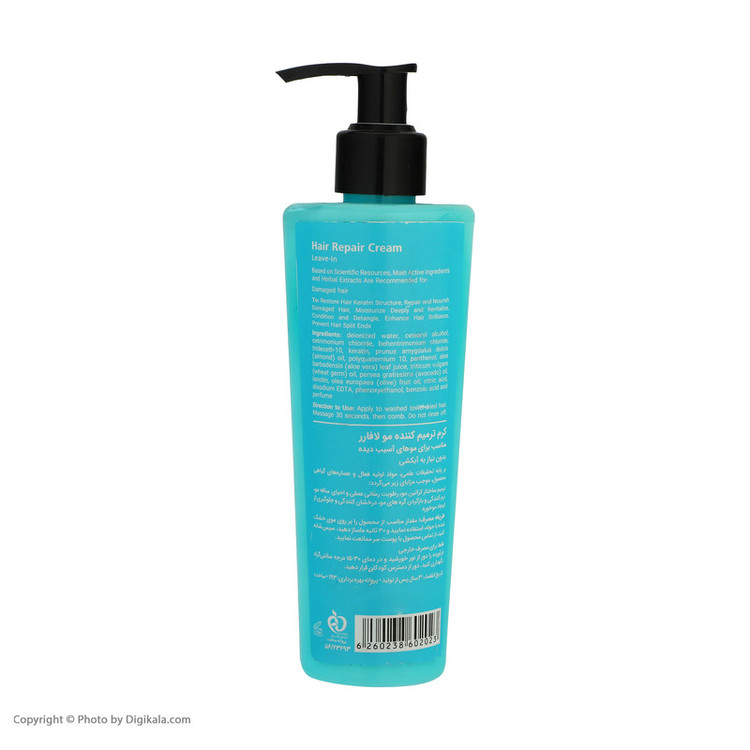 سایر توضیحات: بدون نیاز به آبکشی، مقدار مناسب از محصول را بر روی موی خشک شده با حوله استفاده نمایید و 30 ثانیه ماساژ دهید. سپس شانه کنید. از تماس محصول با پوست سر ممانعت نمایید.