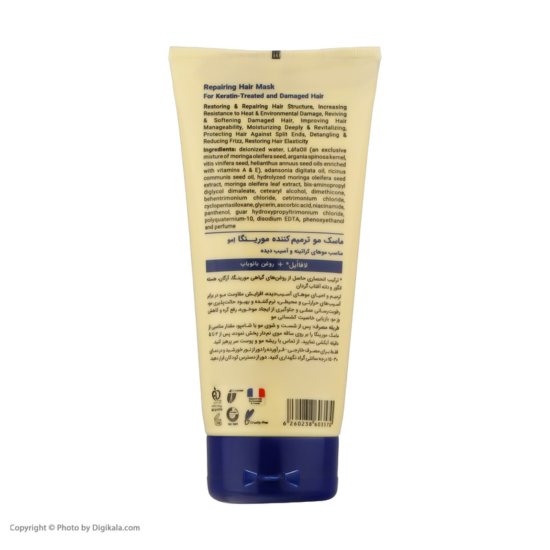 • ترمیم و بازسازی ساختارکراتین مو • رطوبترسانی عمقی و پیشگیری از ایجاد موخوره • نرم کننده و احیای موهای خشک و آسیب دیده • بهبود حالتپذیری و افزایش خاصیت کشسانی تارهای مو • جلوگيری از آسيبهای ناشی از نور خورشید و ضد آلودگیهای محیطی