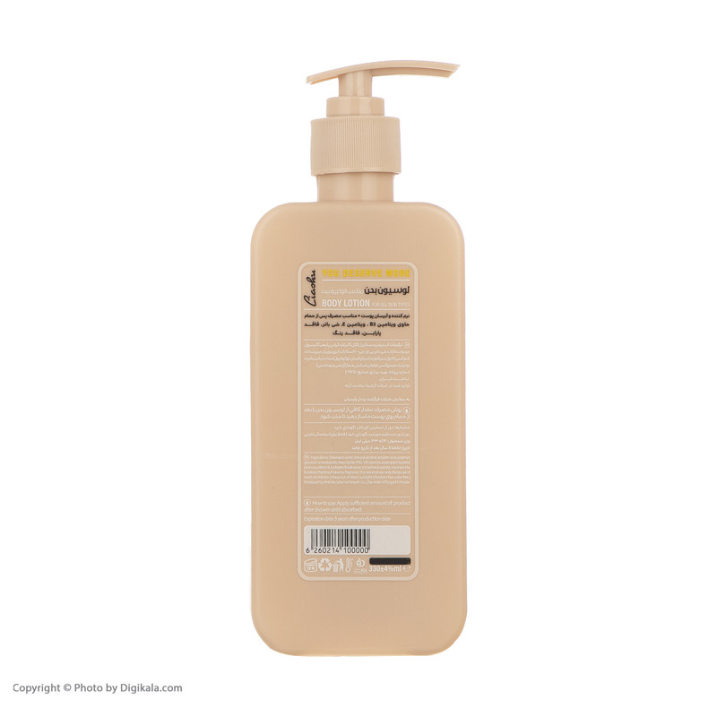 حاوی ویتامین B3، ویتامین E، روغن آرگان، شی باتر، فاقد پارابن، فاقد رنگ / لوسیون بدن با خاصیت نرم کنندگی و آبرسانی فوق العاده مناسب مصرف پس از حمام برای انواع پوست