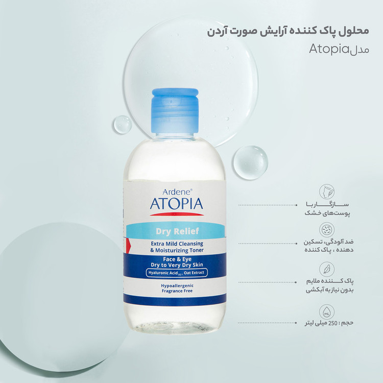 تونر پاک کننده صورت و چشم آردن آتوپیا مدل Dry Relief مناسب پوست خشک و خیلی خشک حجم 250 میلی لیتر