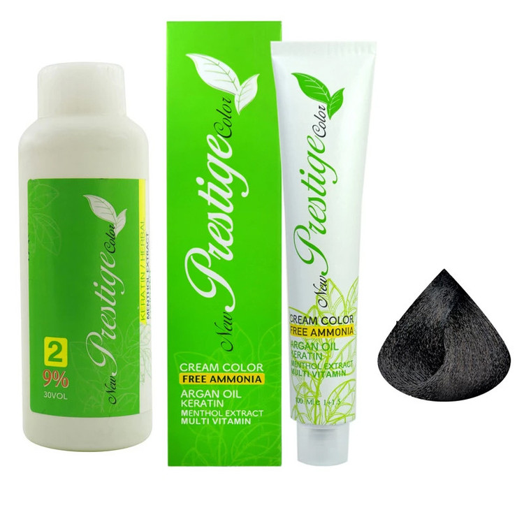 رنگ مو نیو پرستیژ کالر شماره 1 حجم 100 میلی لیتر رنگ مشکی به همراه اکسیدان نیو پرستیژ کالر مدل 2 نه درصدی حجم 150 میلی لیتر