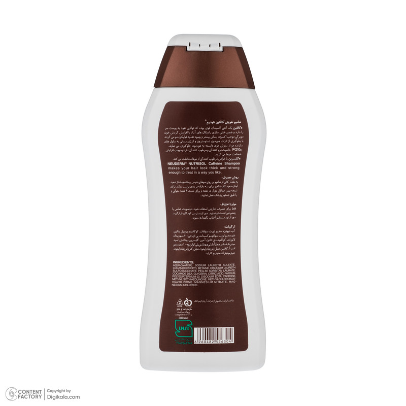 حاوی کافئین به عنوان ماده موثره، جلوگیری از ریزش و محرک رشد مو، افزایش ضخامت و استحکام مو، نرمی و لطافت مو