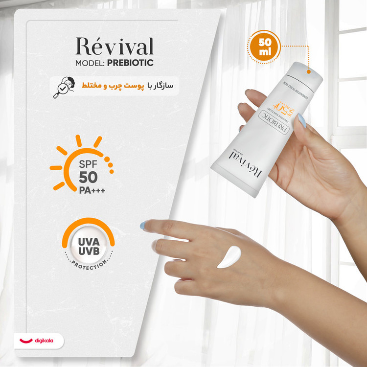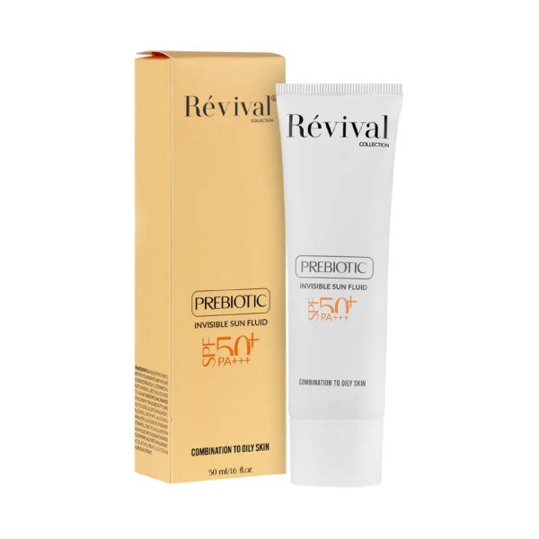 کرم ضد آفتاب بی‌رنگ کلکسیون رویوال، spf 50، مدل prebiotic، ‌مناسب پوست‌های چرب و مختلط با حجم 50 میلی‌لیتر، محافظت‌کننده در برابر اشعه‌های UVA و PA ،UVB+++، ضد جوش و آکنه، دارای فرمولاسیون آنتی اکسیدان، نیاسینامید و ویتامین E، با ماندگاری 5 ساعته