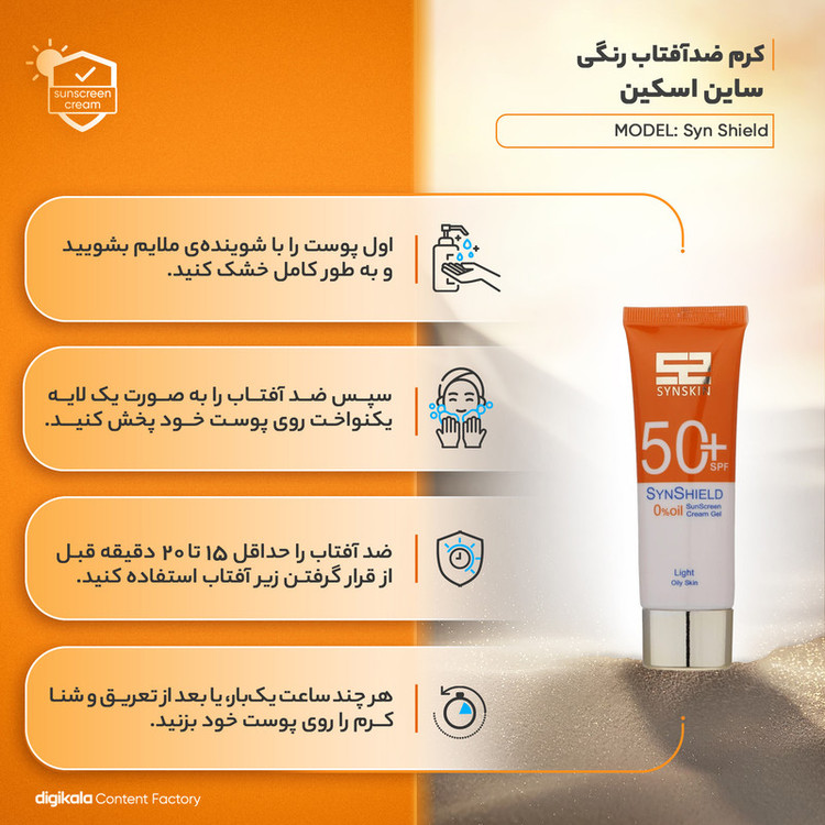 راهنمای استفاده : حداقل 15 دقیقه قبل از مواجهه با نور خورشید به اندازه دو انگشت از کرم ژل ضدآفتاب ساین اسکین را روی پوست صورت و گردن استفاده نمایید. توجه داشته باشید که با وجود مقاومت این محصول در برابر شستشو و تعریق، توصیه میشود هر دو ساعت یکبار آن را تجدید کنید.