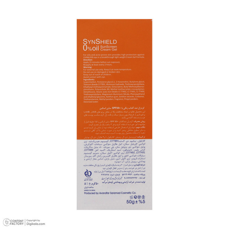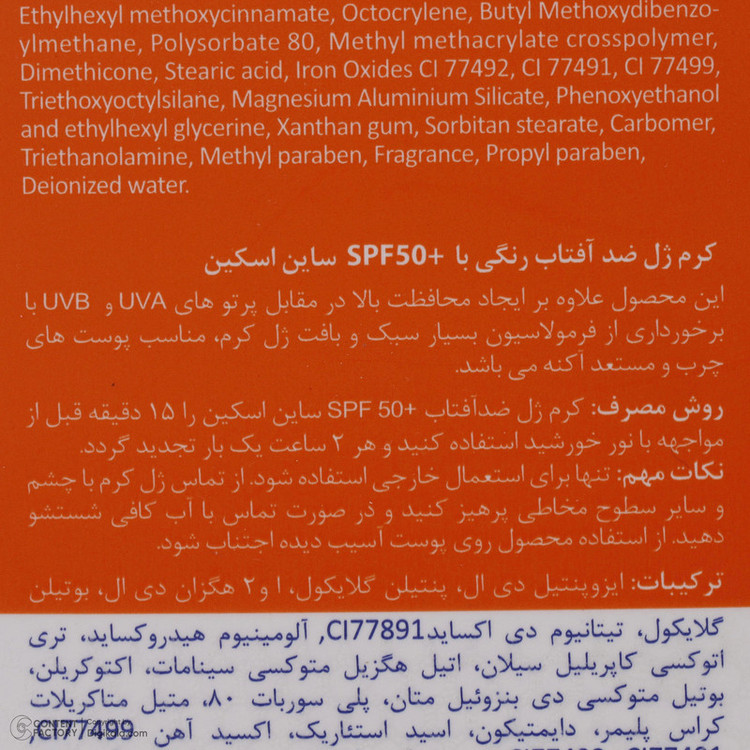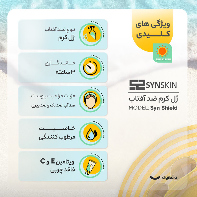 ویژگیهای ضدآفتاب : ضد آب , محافظت کننده در برابر اشعه UVA , محافظت کننده در برابر اشعه UVB , مرطوب کننده