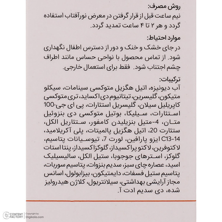 نیم ساعت قبل از قرار گرفتن در معرض نور آفتاب استفاده گردد. کرم ضد افتاب بنا به صلاحدید شما هر 2 تا 4 ساعت یکبار تمدید گردد.
