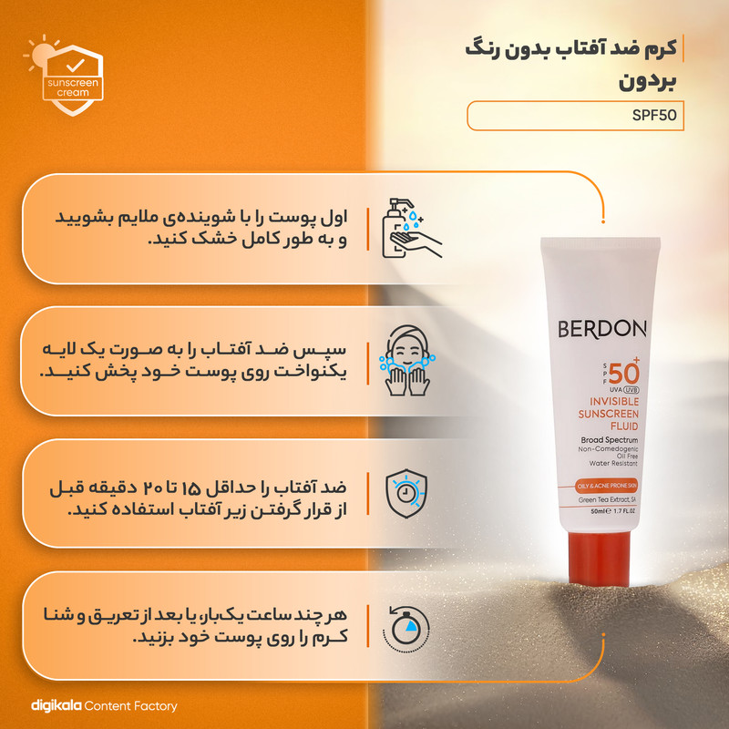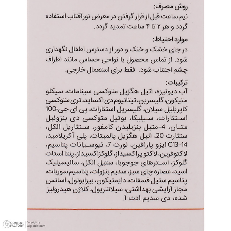 نیم ساعت قبل از قرار گرفتن در معرض نور آفتاب استفاده گردد. کرم ضد افتاب بنا به صلاحدید شما هر 2 تا 4 ساعت یکبار تمدید گردد.