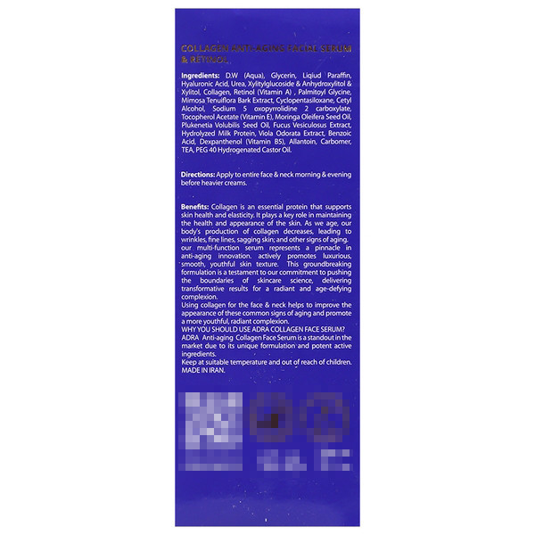 ملاحظات مصرف: در صورت بروز هرگونه حساسیت و آلرژی از ادامه مصرف خودداری نمایید. سرم ضد چروک صورت و گردن آدرا را در دمای مناسب و دور از دسترس کودکان نگهداری نمایید.